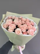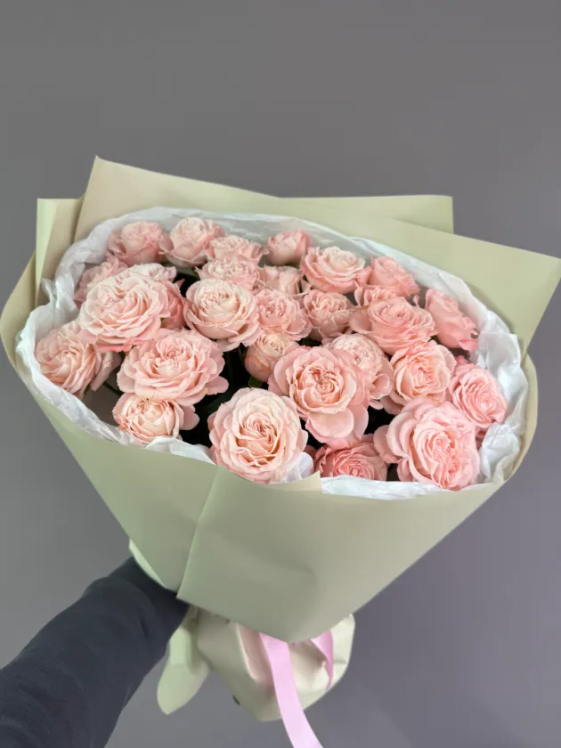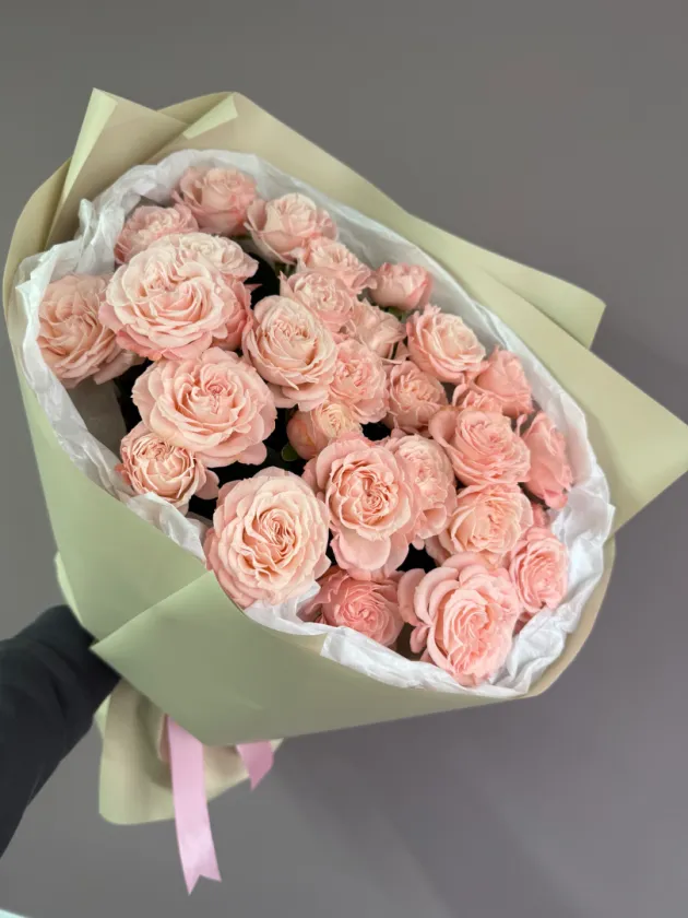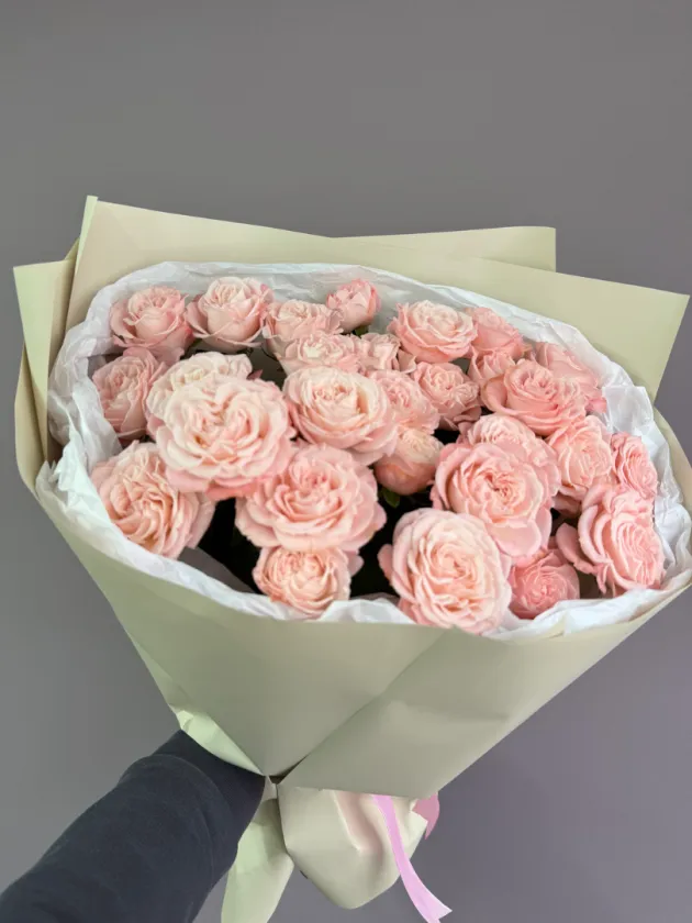 Композиция из кустовых пионовидных роз сорта «Мадам Бомбастик». Их нежно-розовый цвет, словно первый свет зари, очаровывает своей утонченностью. Эти розы – настоящие произведения искусства природы: их густо махровые бутоны, напоминающие пышные помпоны, медленно раскрываются, демонстрируя невероятную красоту и воздушность лепестков. Каждый бутон – это маленький шедевр, созданный природой с невероятной тщательностью. Вы заметите плавные переходы оттенков розового, от насыщенного персикового до светлого, почти кремового, в зависимости от степени раскрытия цветка. Это придает букету неповторимую глубину и живость. Он упакован в изящную бумагу пастельных тонов и лентой в тон роз.