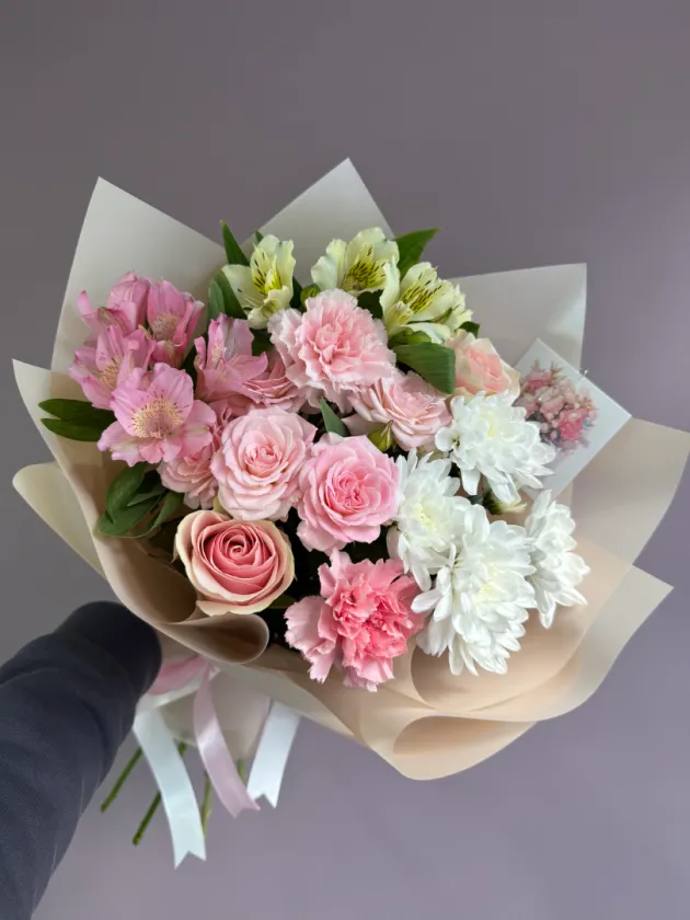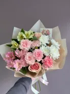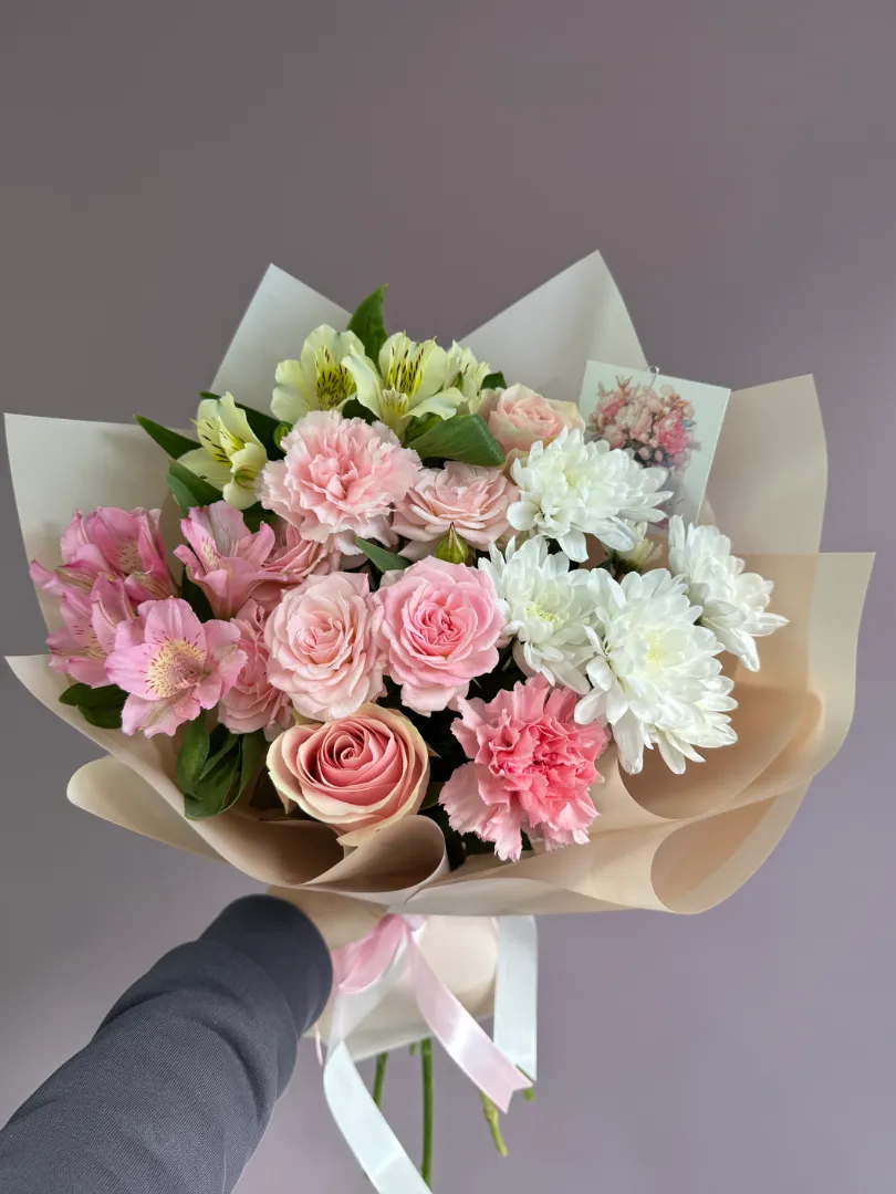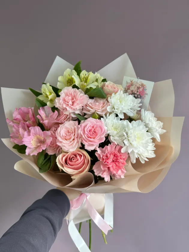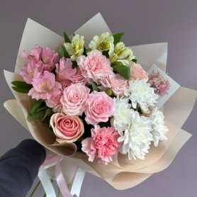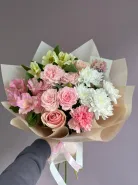 Сборный букет из разных цветов в нежной гамме подойдет для любого повода, станет украшением и прекрасным подарком.