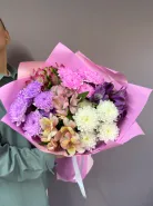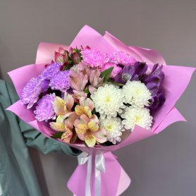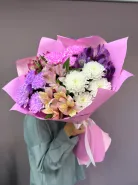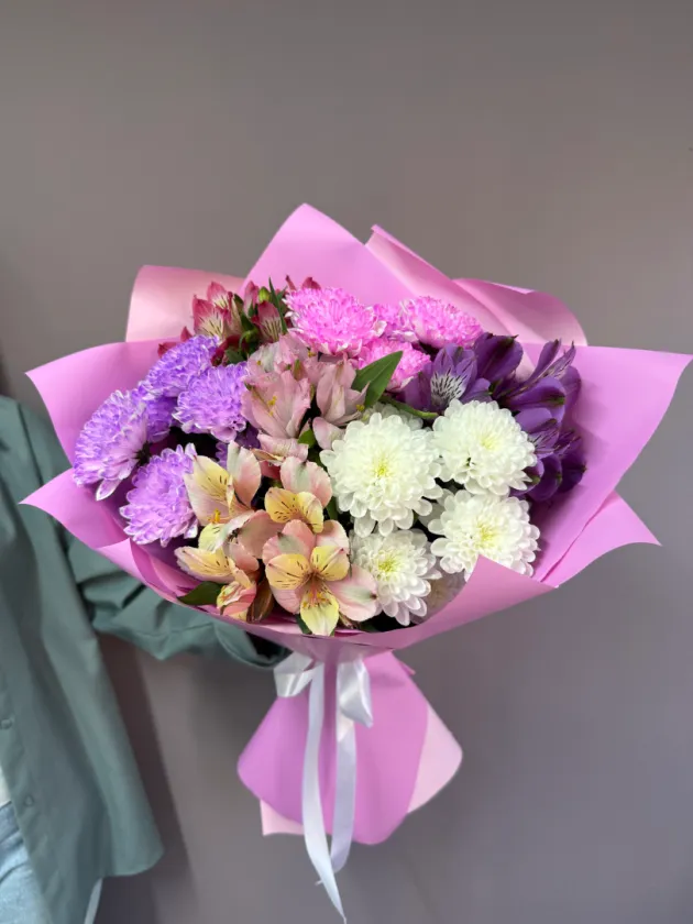 Букет с альстромериями и хризантемами «Розовая дымка»