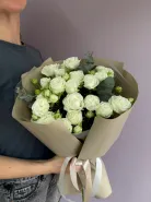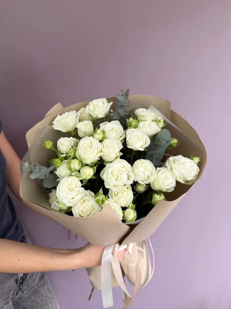 Букет белые кустовые розы с эвкалиптом «Леди»