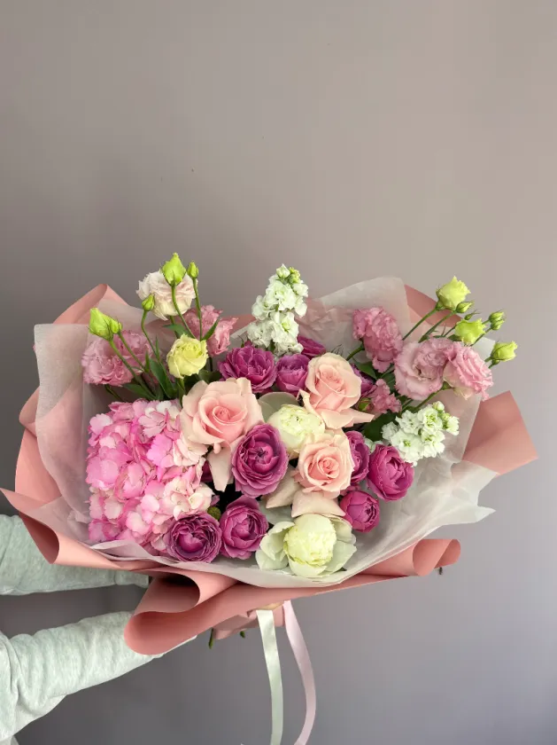 Букет с пионами пионовидными розами и гортензией «Очарованье»