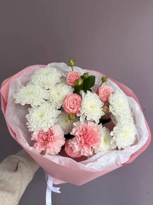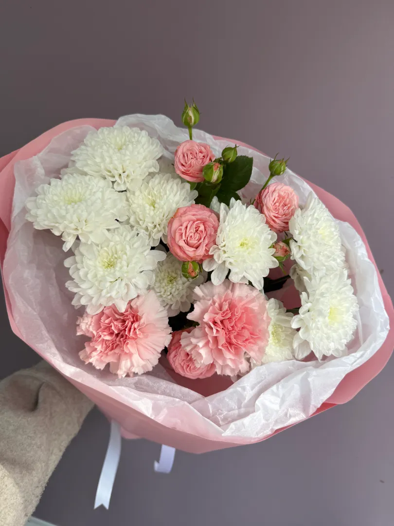 Букет с хризантемами кустовой розой и диантусами «Первый танец»