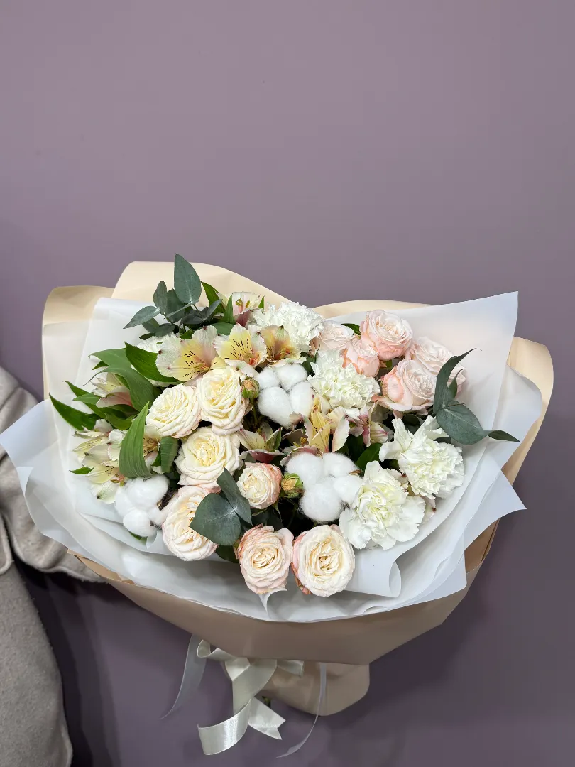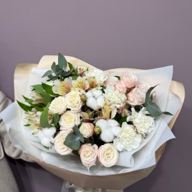 Букет с кустовыми розами и диантусами «Пралине»