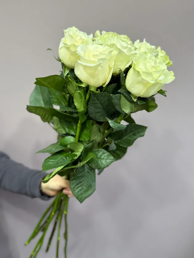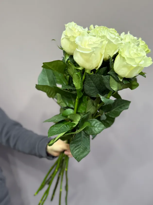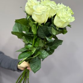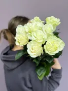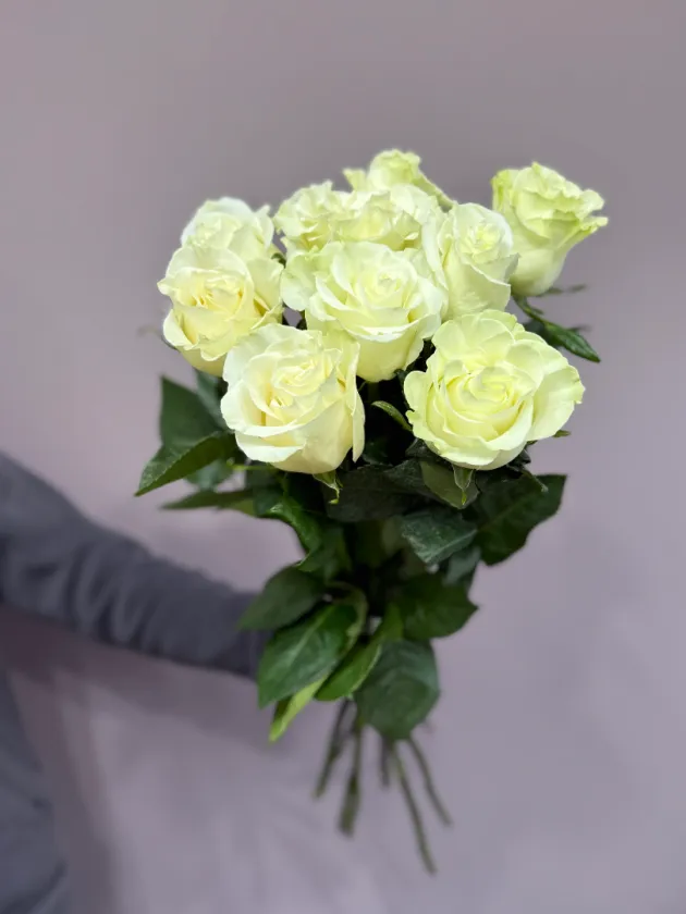 Букет, наполненный нежностью и элегантностью, состоящий из светлых белых роз, символизирующих чистоту и любовь. Этот букет создает атмосферу спокойствия и гармонии.