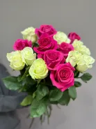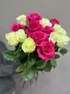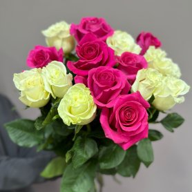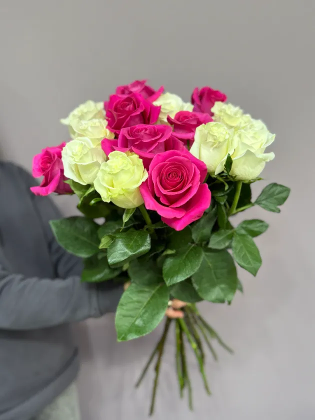 Букет, состоящий из нежных белых и ярких розовых роз, выглядит воздушно и элегантно. Сочетание цветов добавляет композиции игривости и романтичности, делая букет идеальным для выражения тёплых чувств.