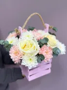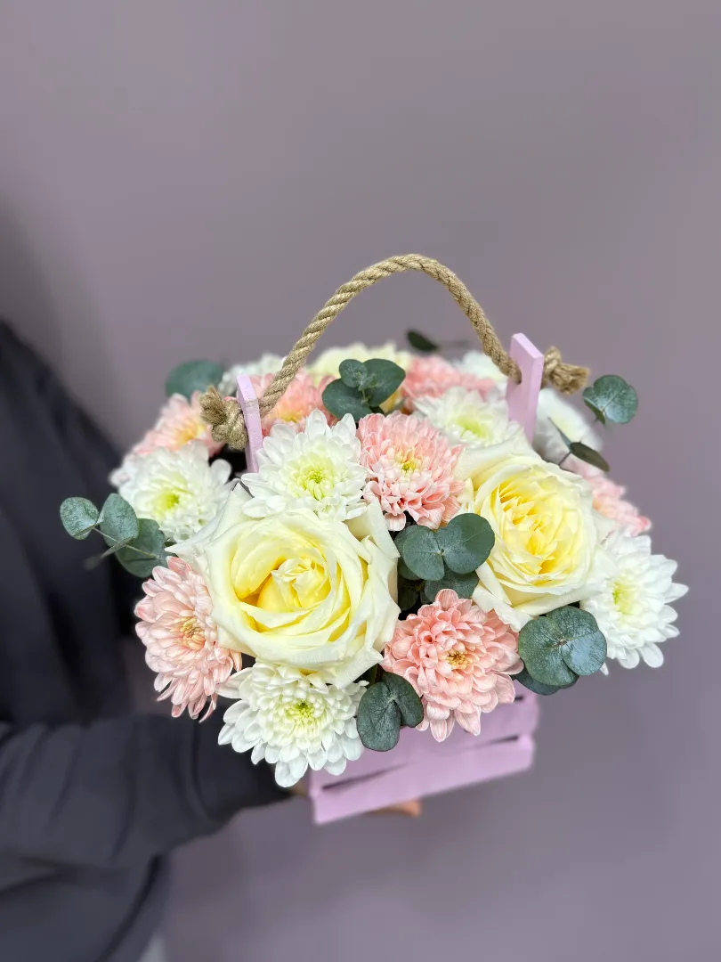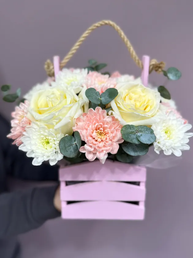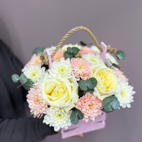 Букет в нежных тонах в деревянном ящичке станет прекрасным подарком для близких и друзей. Тонкие оттенки белых и розовых цветов в сочетании с зеленью эвкалипта создают ощущение свежести и природной красоты. В композицию входят кремовые розы и розовые хризантемы.