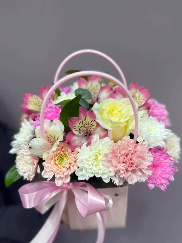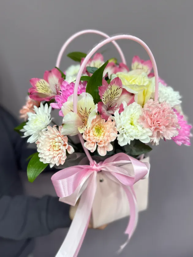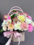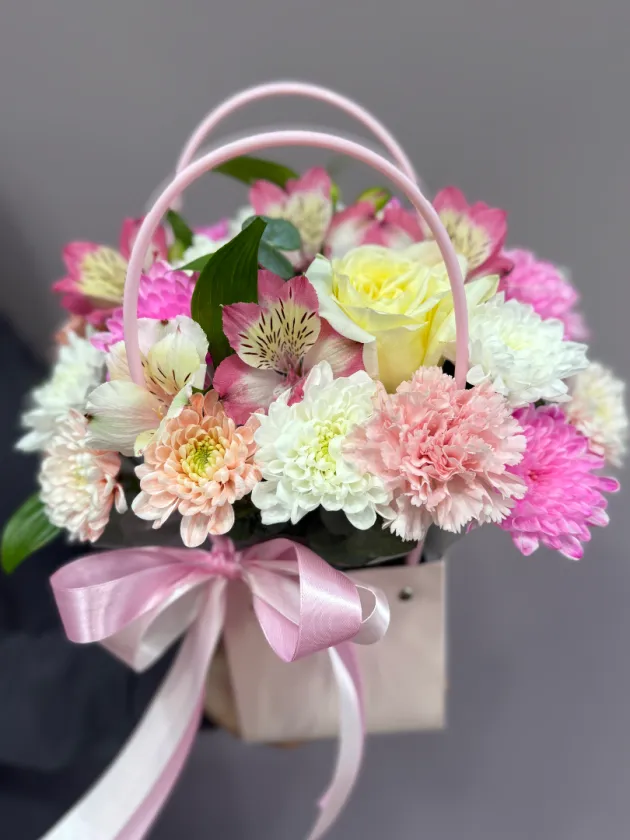Нежный букет в светло-розовой корзине, украшенный атласной лентой, станет прекрасным подарком для близких. В его составе белые розы, розовые и белые хризантемы, а также альстромерии. Тонкие оттенки и разнообразие цветов создают образ трогательной заботы и искреннего внимания.