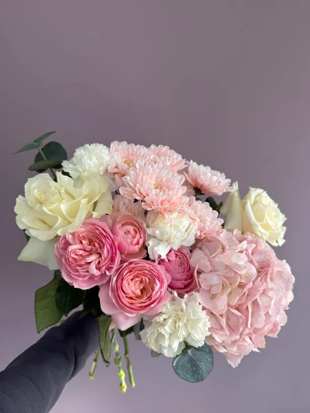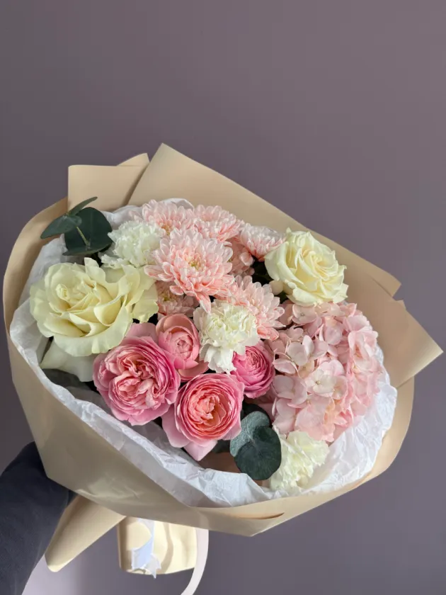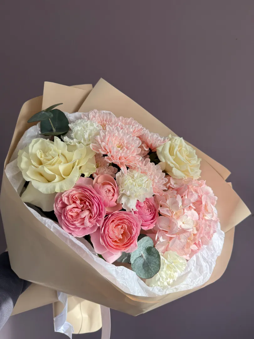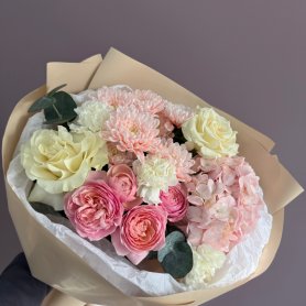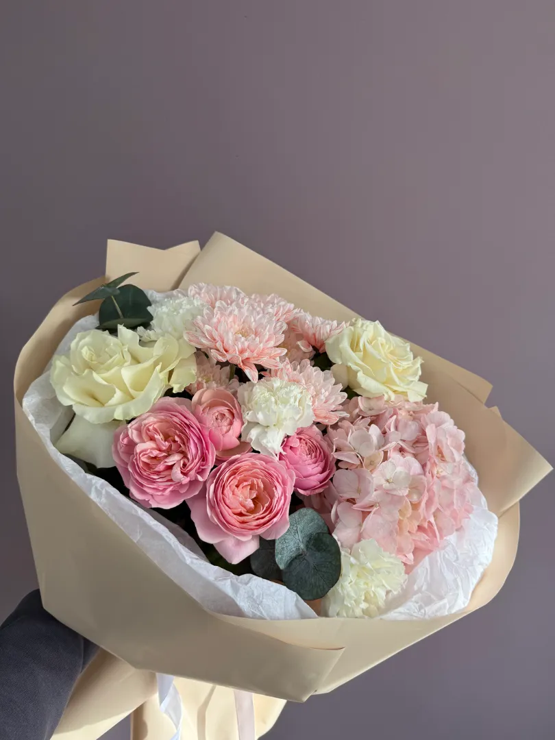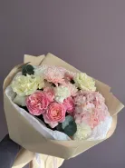 Нежный букет в пастельных тонах, созданный из розовых и белых роз, гортензии и диантусов. Этот букет идеально подойдёт для выражения нежных чувств и эмоций. Композиция отличается воздушностью и лёгкостью, что делает её прекрасным подарком для любого торжества.