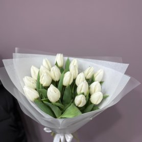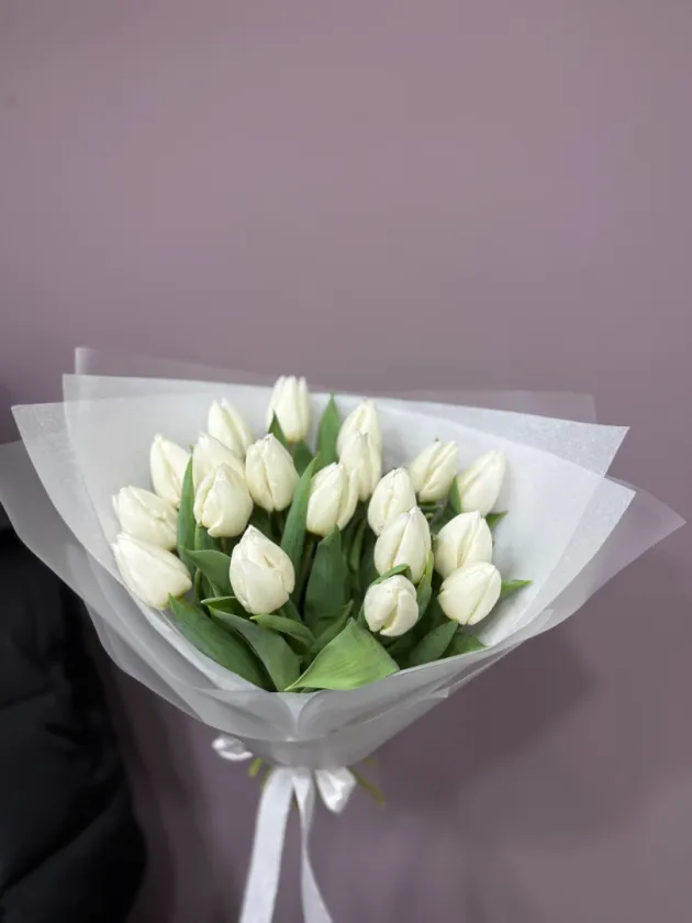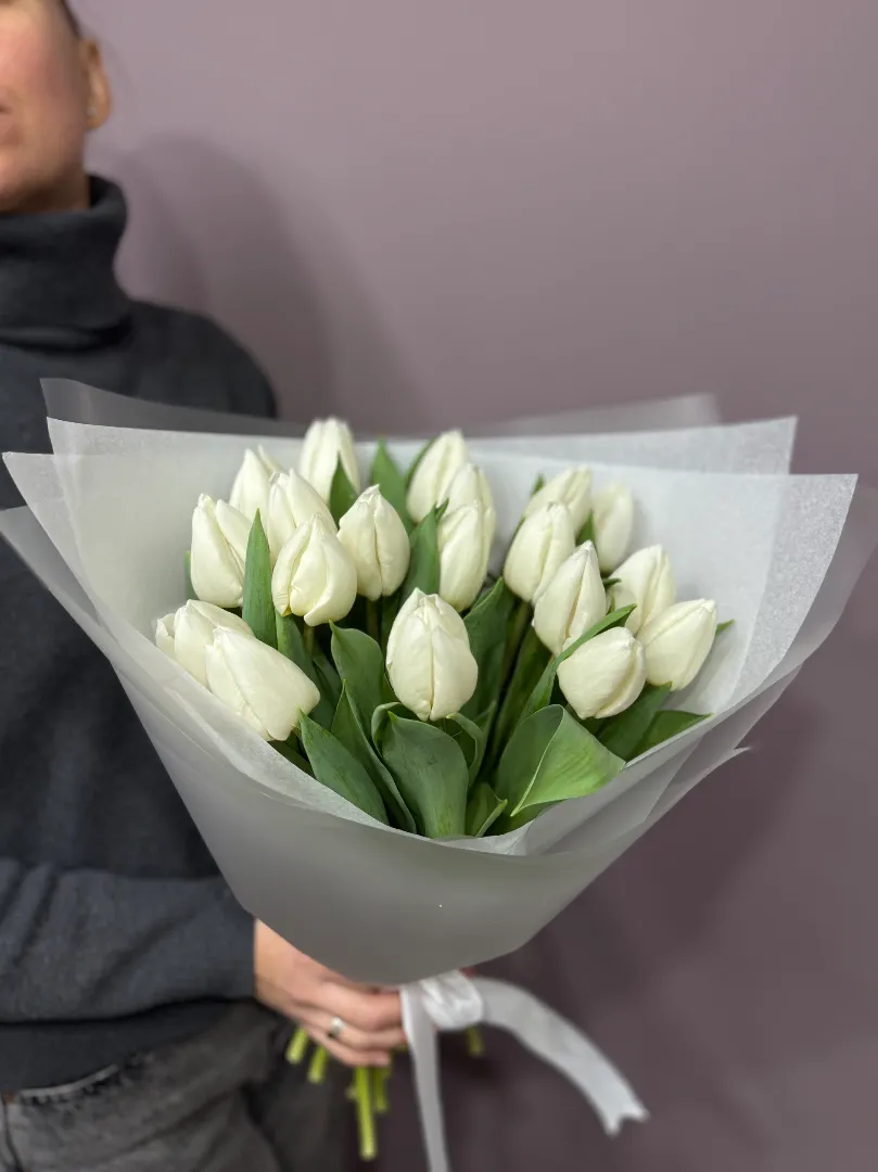 Белые тюльпаны Леди — это элегантность и нежность в каждом бутоне. Их чистый белый цвет добавит свежести и утонченности любому интерьеру или праздничному столу.