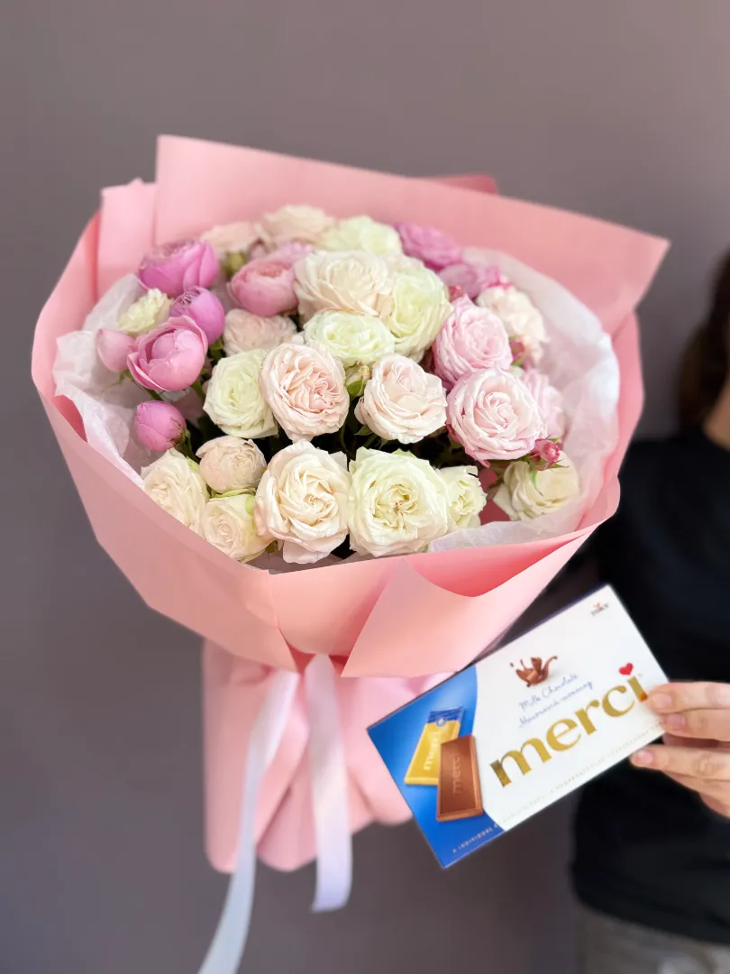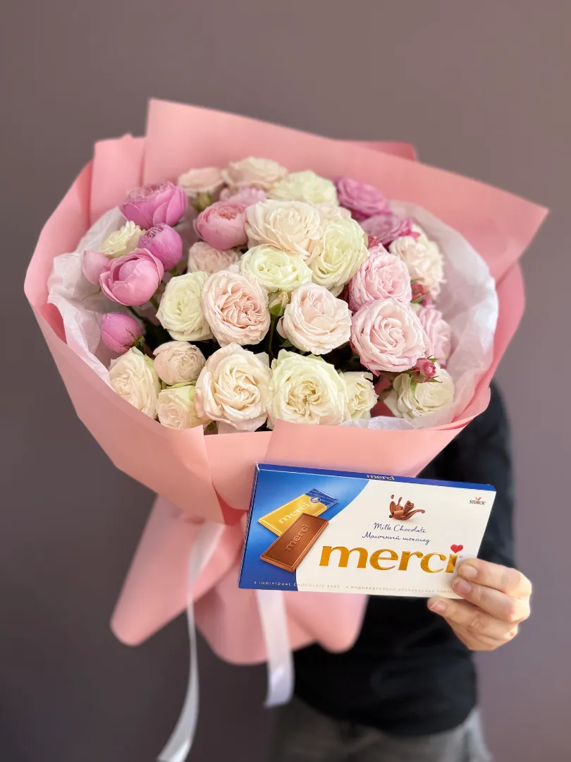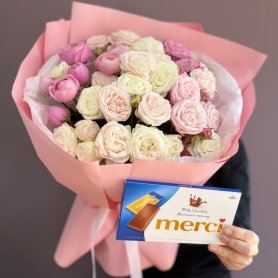 Этот изысканный набор включает в себя роскошный букет кустовых роз, создающих нежную и романтичную атмосферу, и сладкий шоколад «Мерси», который прекрасно дополнит букет и подарит приятные моменты наслаждения. Такой набор идеально подойдет для выражения благодарности или для особого случая. Он станет эффектным и трогательным подарком для близкого человека.