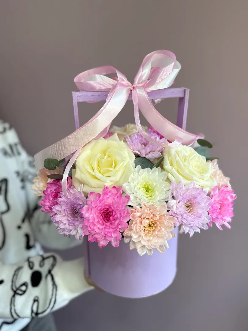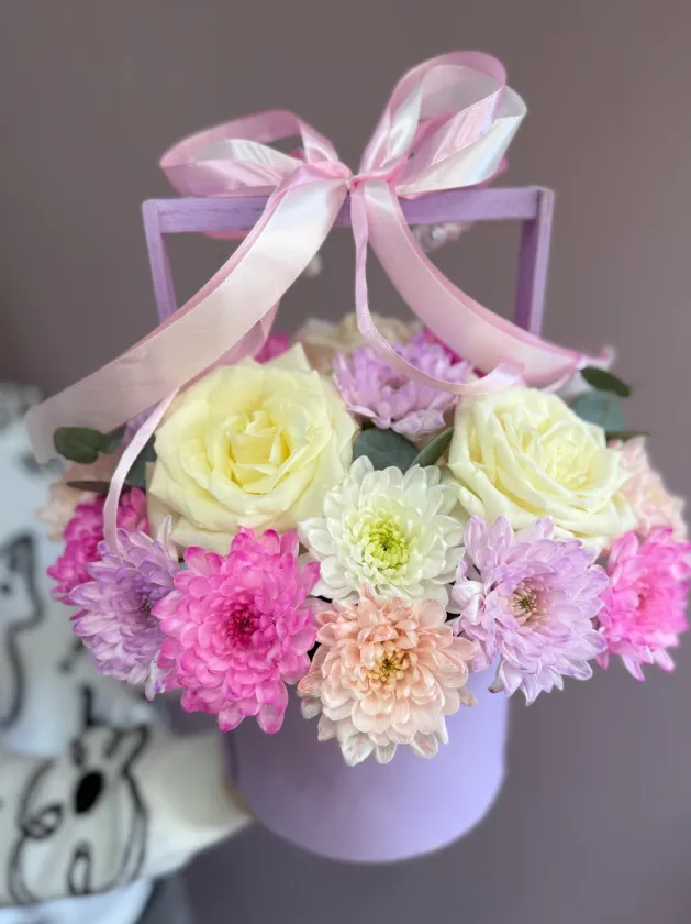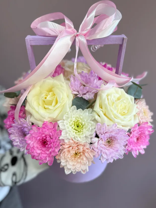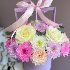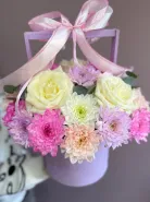 Нежный букет в пастельных тонах, состоящий из белых роз, розовых и белых хризантем, оформлен в лавандовой коробке и украшен атласной лентой. Этот букет станет прекрасным подарком для любого случая, наполняя его нежностью и элегантностью. Букет символизирует любовь, признательность и заботу.