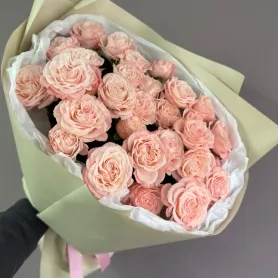 Композиция из кустовых пионовидных роз сорта «Мадам Бомбастик». Их нежно-розовый цвет, словно первый свет зари, очаровывает своей утонченностью. Эти розы – настоящие произведения искусства природы: их густо махровые бутоны, напоминающие пышные помпоны, медленно раскрываются, демонстрируя невероятную красоту и воздушность лепестков. Каждый бутон – это маленький шедевр, созданный природой с невероятной тщательностью. Вы заметите плавные переходы оттенков розового, от насыщенного персикового до светлого, почти кремового, в зависимости от степени раскрытия цветка. Это придает букету неповторимую глубину и живость. Он упакован в изящную бумагу пастельных тонов и лентой в тон роз.